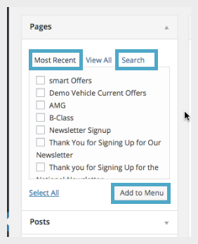 On the left, under the “Pages” area, look for the page you created under “Most Recent,” or you can click on “Search” and search for that page. When you see the page listed, click on it and click “Add to Menu.”