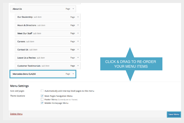 The page will be added to the very bottom of the navigation, so scroll down. It can be dragged up to the area you would like it to be placed in your navigation. Please keep in mind that main menu items are left aligned, and then their respective sub-items are tabbed into the right. Be sure to align your page properly. Click “Save Menu” located at the top and bottom of the page to save your menu changes.