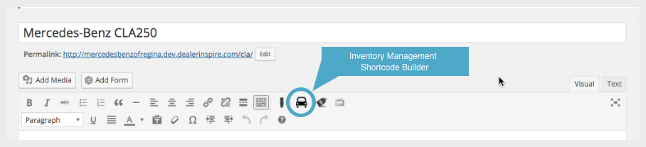 Give your inventory page a title in the top bar. Then click the “Inventory Shortcode Management Builder” car icon in the text toolbar area. When the window opens, click “Display Inventory.”