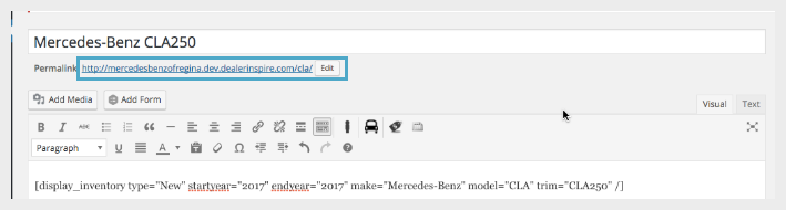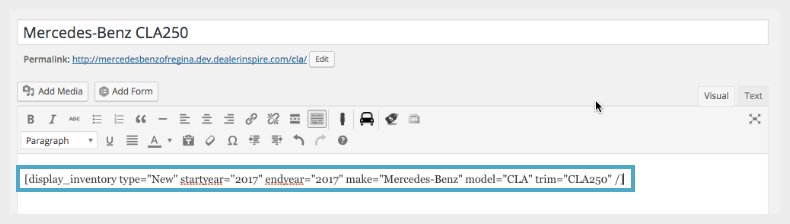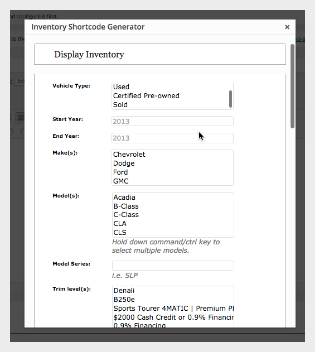 The shortcode generator allows you to create a page for a variety of vehicle specifics. Choose your desired options to create your page. For example, if you wanted a page to display a New Mercedes-Benz C-Class you would choose the following: